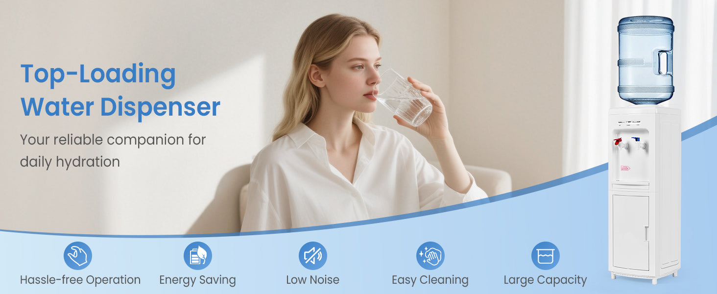 ● Compact Design and Large Storage Cabinet: This water dispenser features a compact design suitable for any corner in your home to save space. A cabinet at the bottom is large enough for you to store plastic bottles, drinks, instant coffee, or paper cups.