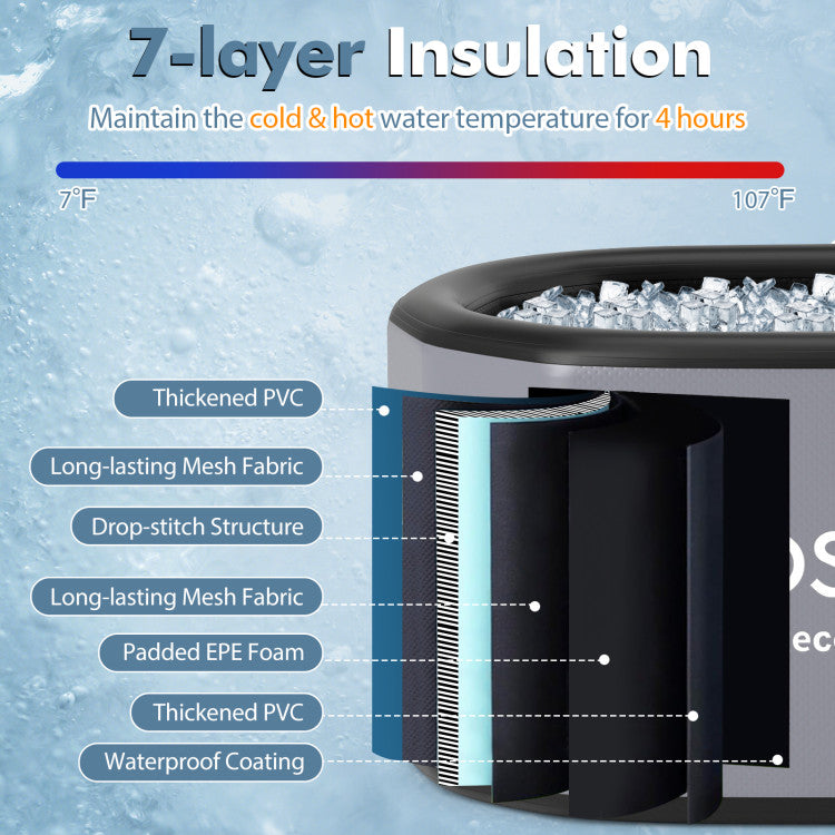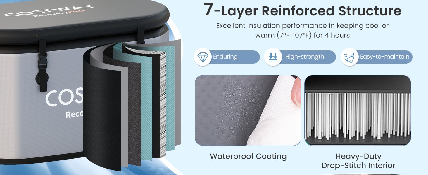 ● Drop-stitch Structure for Stability: Constructed with advanced drop-stitch technology, this ice tub supports up to 800 lbs, securely accommodating athletes of various builds. Its 7-layer insulation system maintains water temperatures for up to 4 hours. It is suitable for water temp from 7℉ to 107℉ for cold plunge or warm soak.