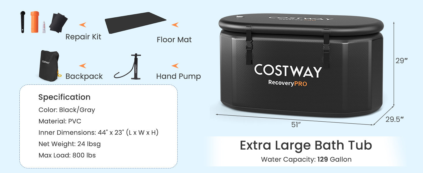 ● What You Will Get: The included hand pump inflates the cold tub with cover in just 2.5 minutes. Furthermore, the backpack, floor mat and repair kit ensure the ice tub's longevity and convenience for future use.